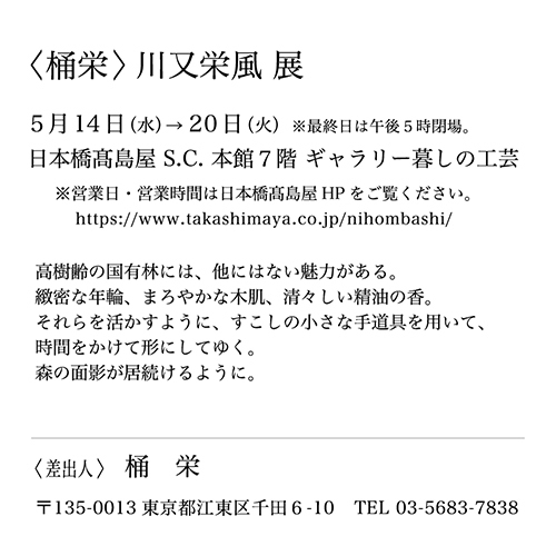 ■<桶栄>川又栄風 展●会 期:2025年 5月14日(水)~5月20日(火) ※最終日は午後5時閉場 ●会 場:日本橋高島屋S.C. 本館7階 ギャラリー暮しの工芸